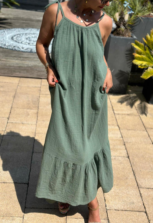 AusverkauftLeichtes Musselin Sommer-Kleid in OLIV