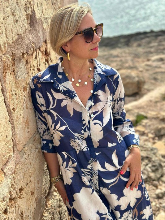 Weit geschnittenes Sommerkleid mit Kragen in BLUE PALMS
