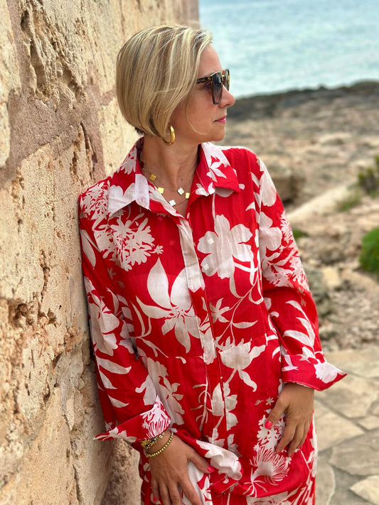 Weit geschnittenes Sommerkleid mit Kragen in RED PALMS