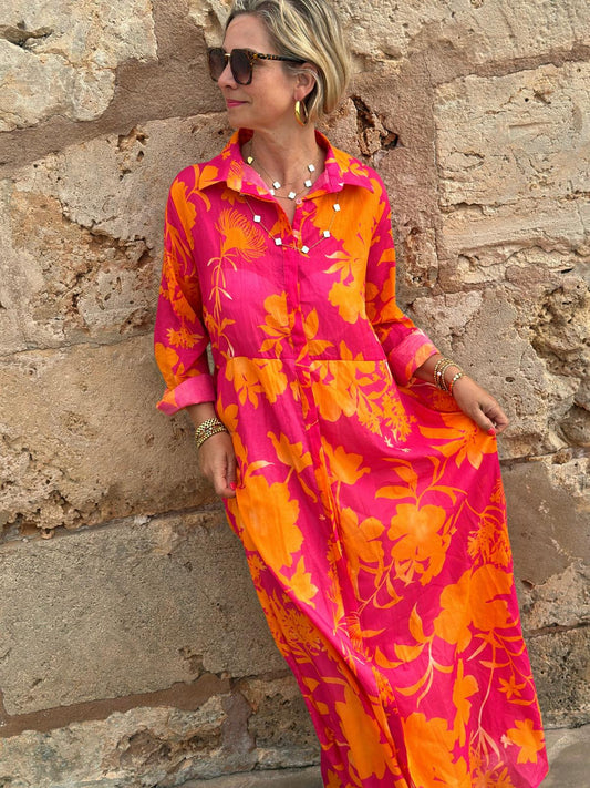 Weit geschnittenes Sommerkleid mit Kragen in SUNSET PALMS