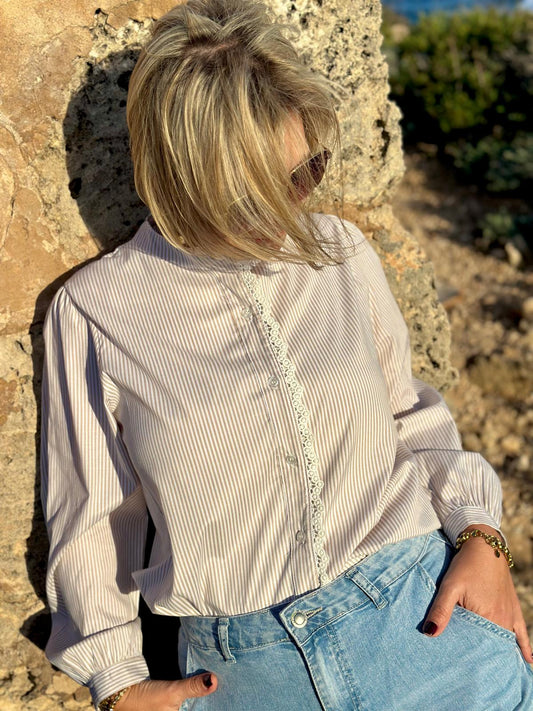 Gestreifte Baumwollbluse mit Spitzenleiste – Desert Cremé