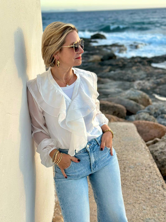 Elegante Volantbluse mit zarter Transparenz in Weiß