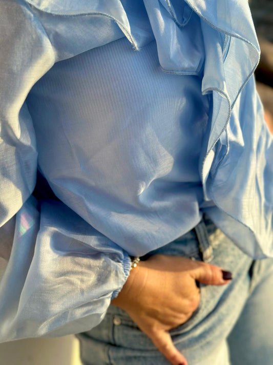Elegante Volantbluse mit zarter Transparenz in Ocean