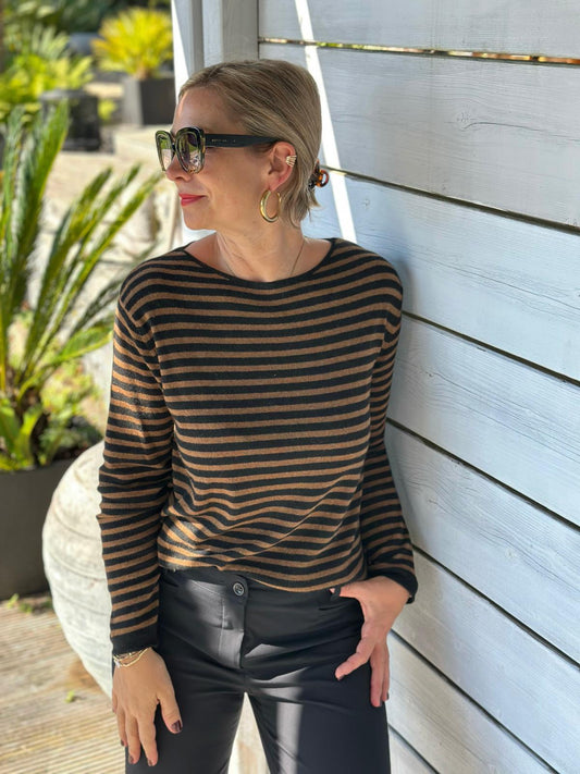 Leichter Cashmere Streifenpulli in Camel/Schwarz