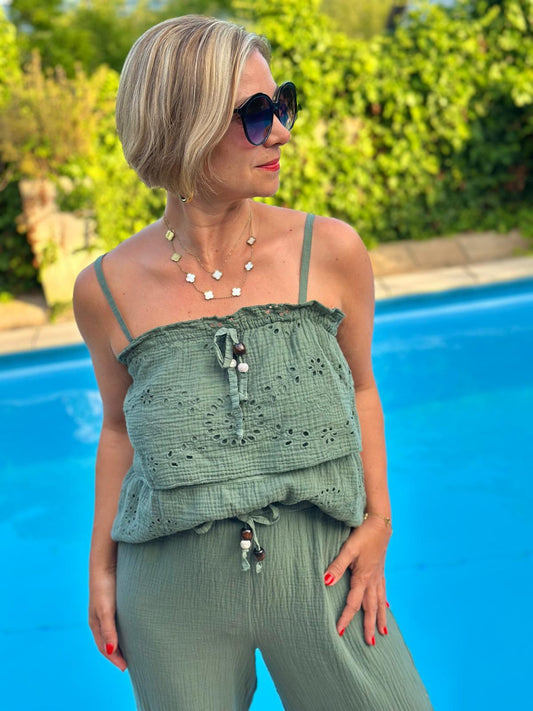 Sommerliches MUSSELIN TOP "FLORENCE" in Oliv