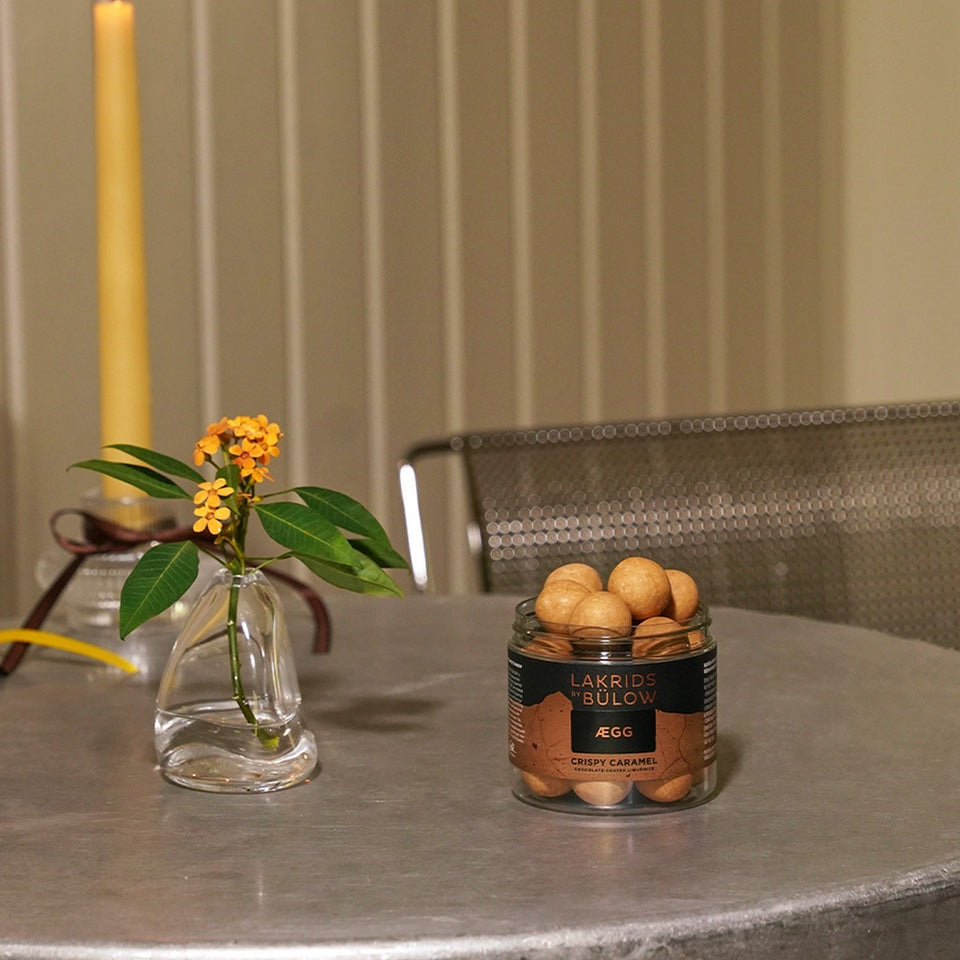 Seidige Dulce-Schokolade vereint sich mit rohem Lakritzpulver und einem Kern aus süßem Lakritz, umhüllt von einer wunderschönen, zart karamellfarbenen und knackigen Zuckerschicht. Kleine Meersalzflocken vollenden das cremig-knusprige Geschmackserlebnis.