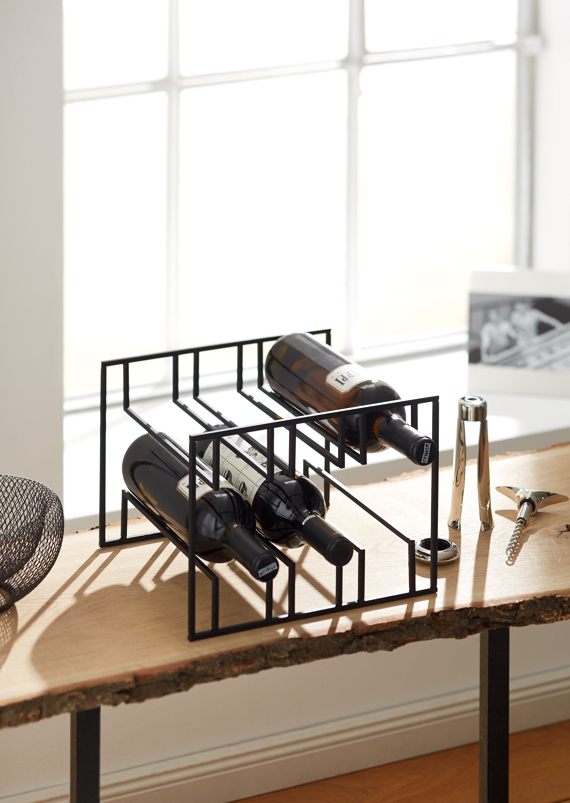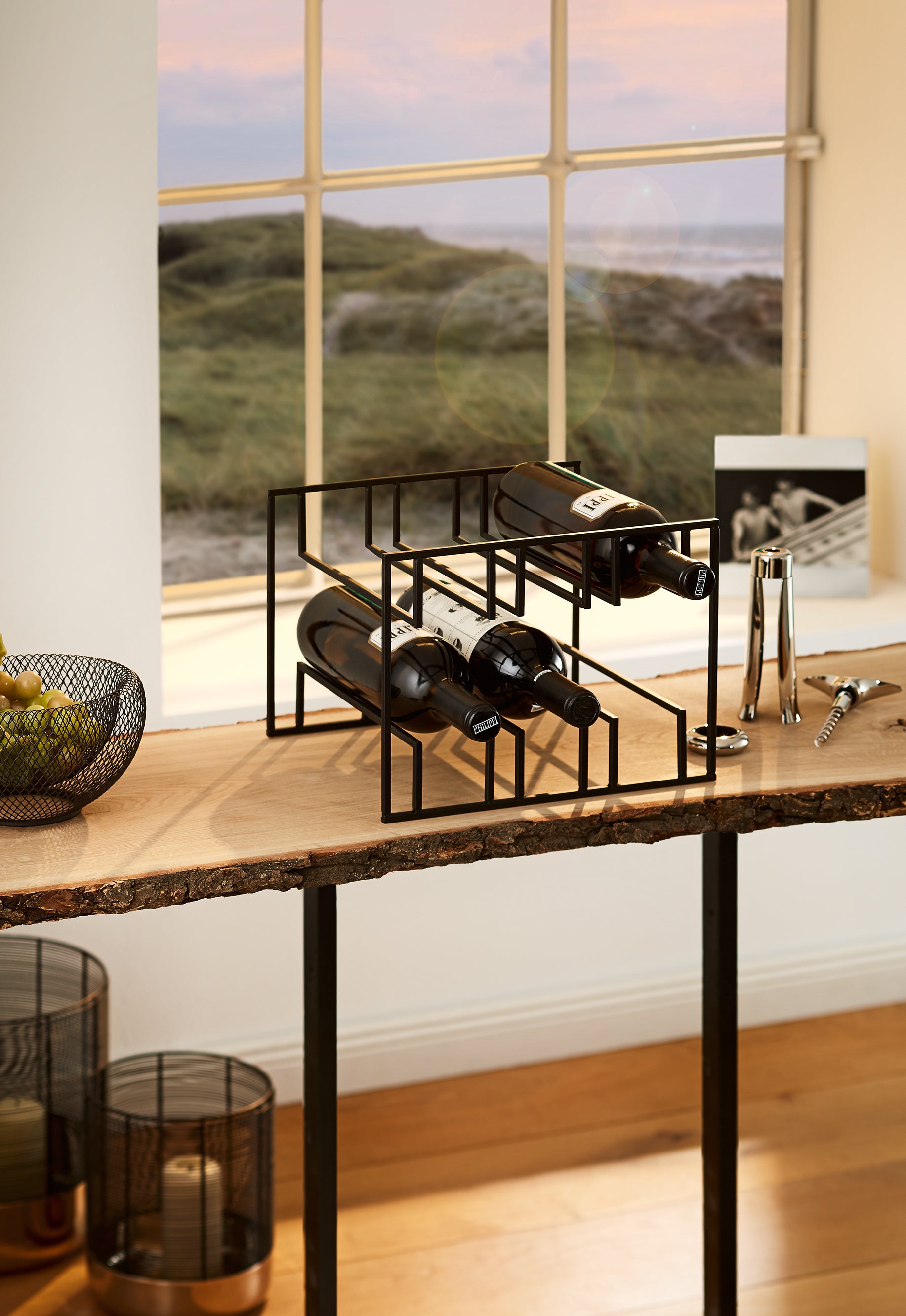 Gut sichtbar und immer in Reichweite lassen sich Weine kaum stilvoller lagern und in Szene setzen. Hier warten 6 Flaschen, überall griffbereit, in gediegener Ruhe auf ihren Einsatz.