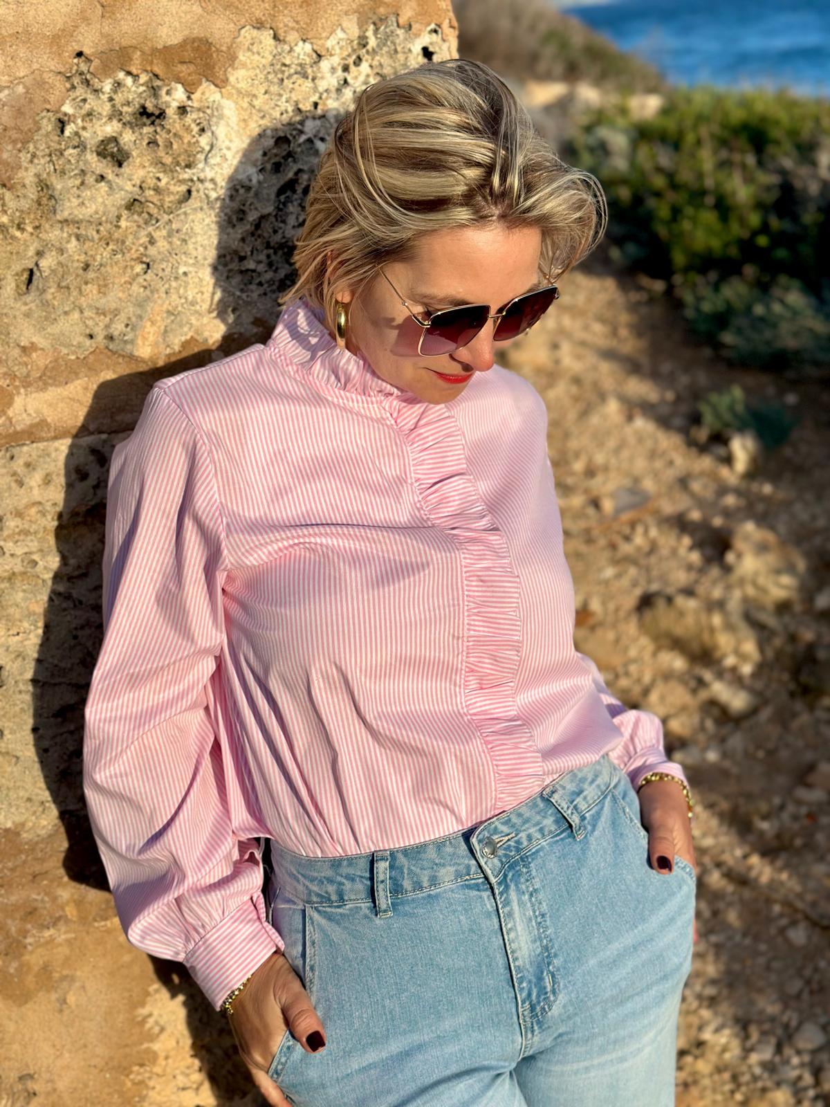 Diese zauberhafte Rüschenbluse vereint klassische Streifenoptik mit femininer Eleganz. Die feine Rüsche entlang der Knopfleiste und der zarte Stehkragen verleihen der Bluse eine besonders stilvolle Note. Der frische Roséton wirkt weich, modern und lässt sich vielseitig kombinieren – von casual bis chic.