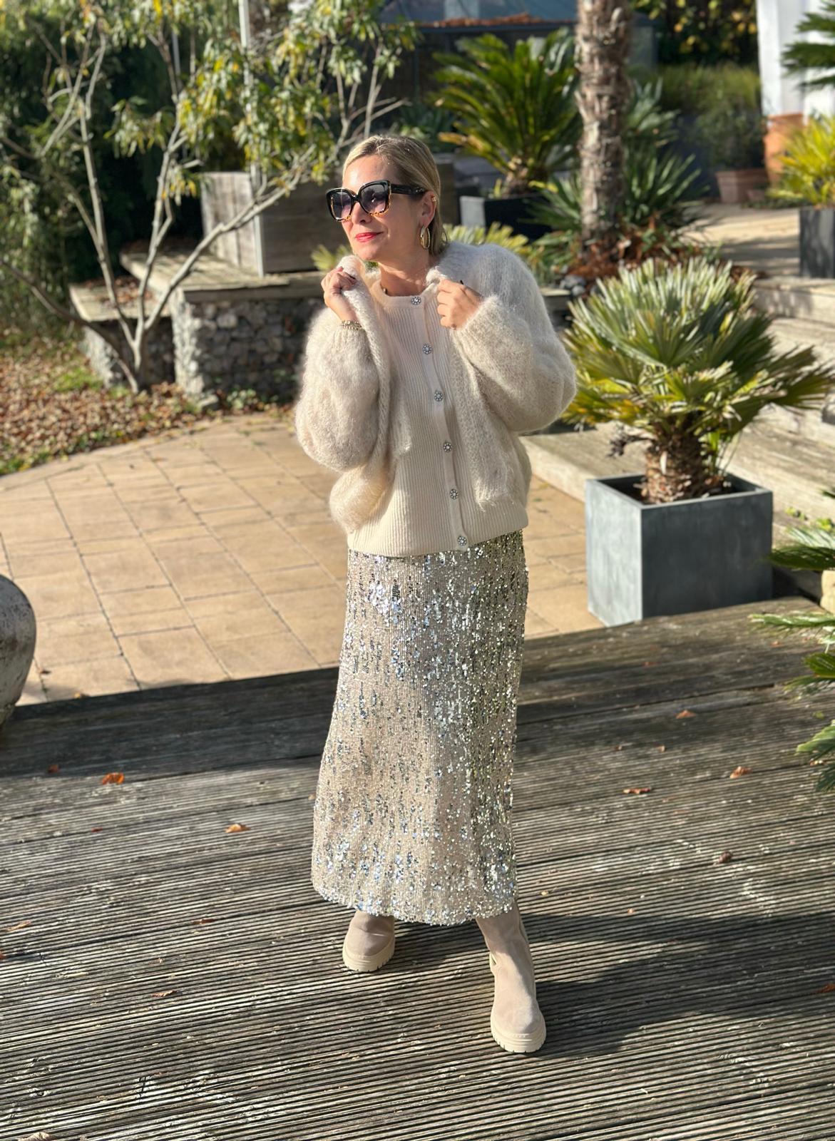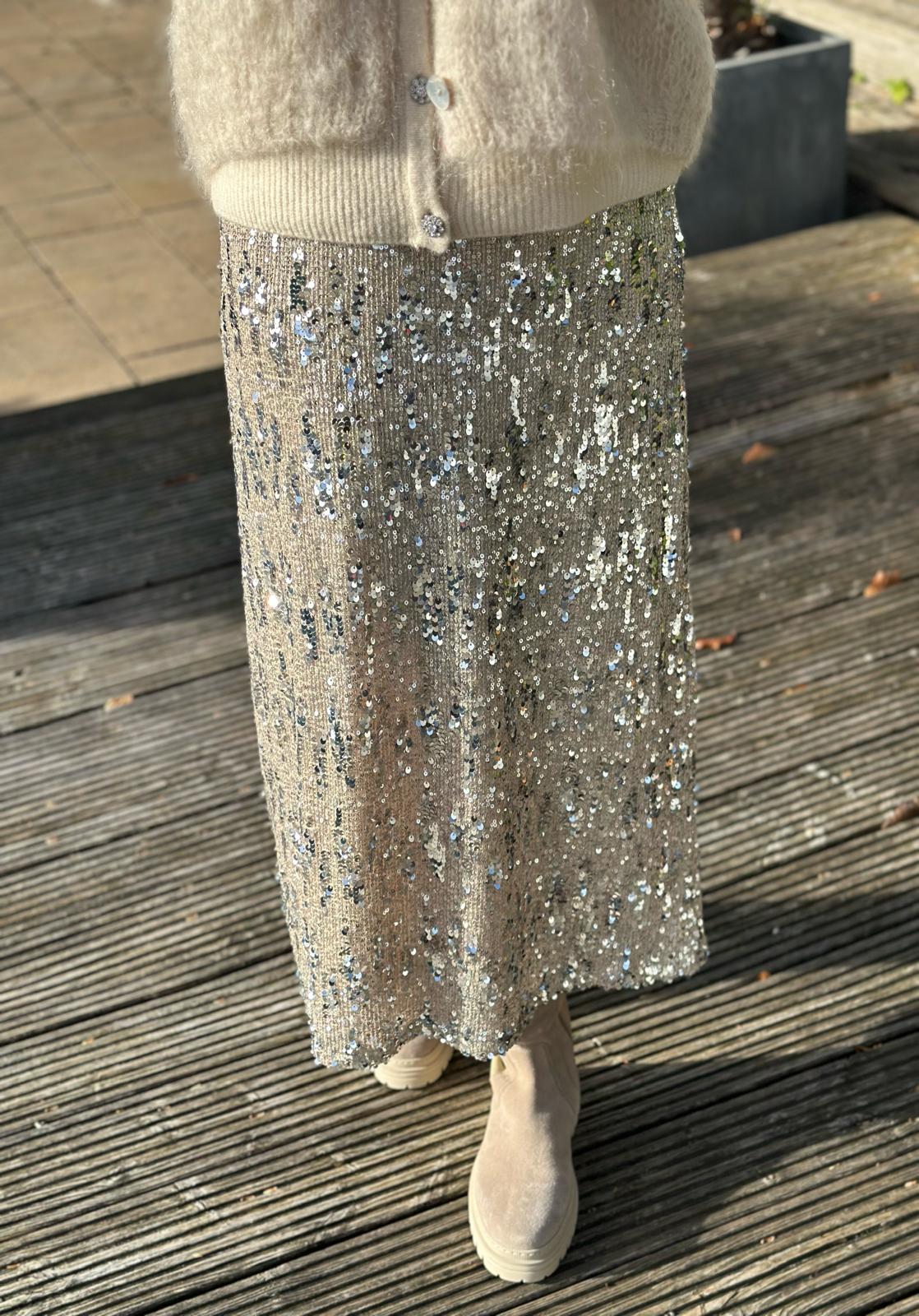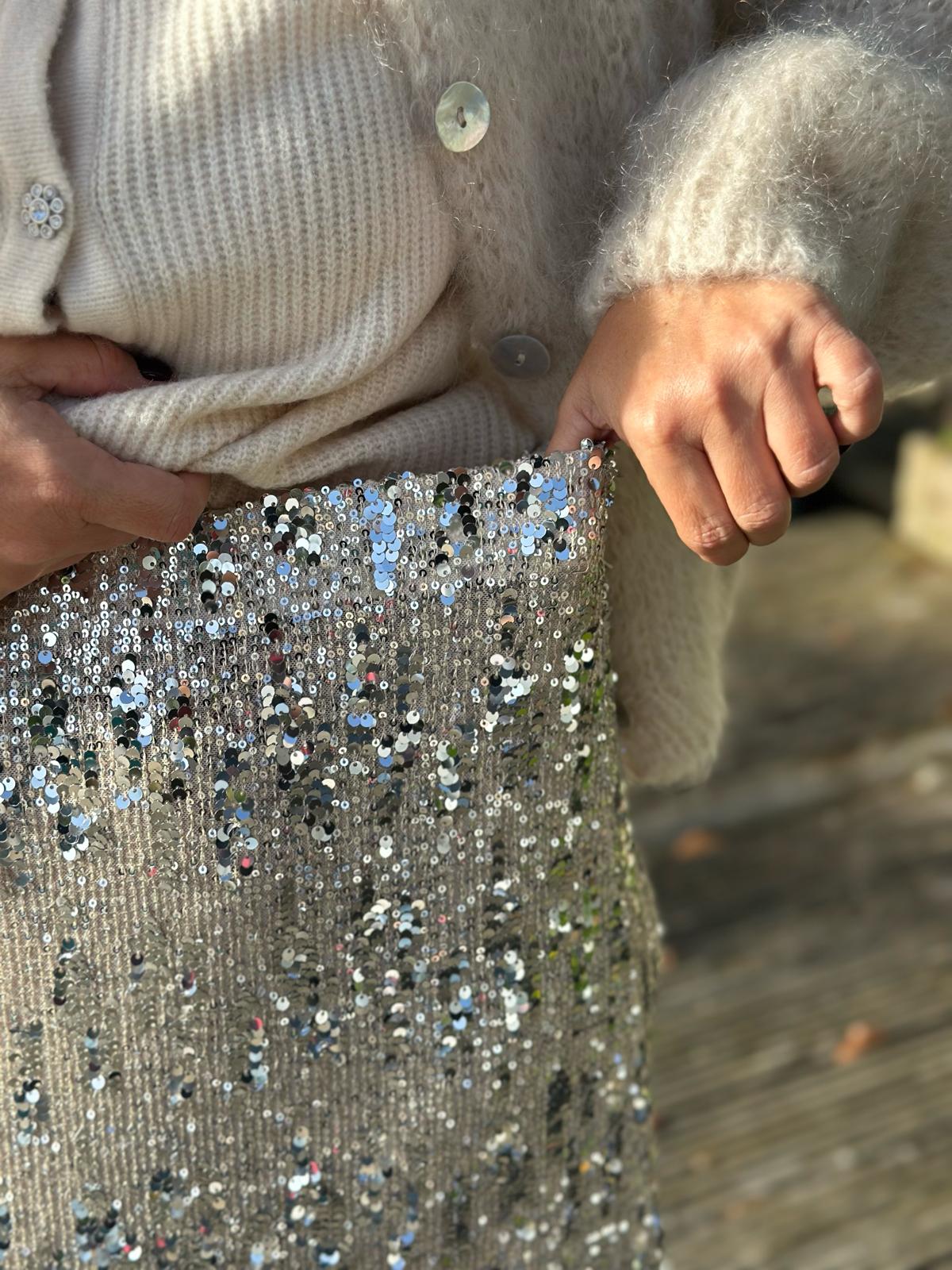 SC-ANGEL 3 ist ein Rock aus 94% Polyester, 6% Elastan. Dieser elegante Rock mit knielangem Schnitt ist mit Pailletten besetzt. Kombiniere ihn mit einer taillierten Bluse und hohen Schuhen für einen eleganten Look.