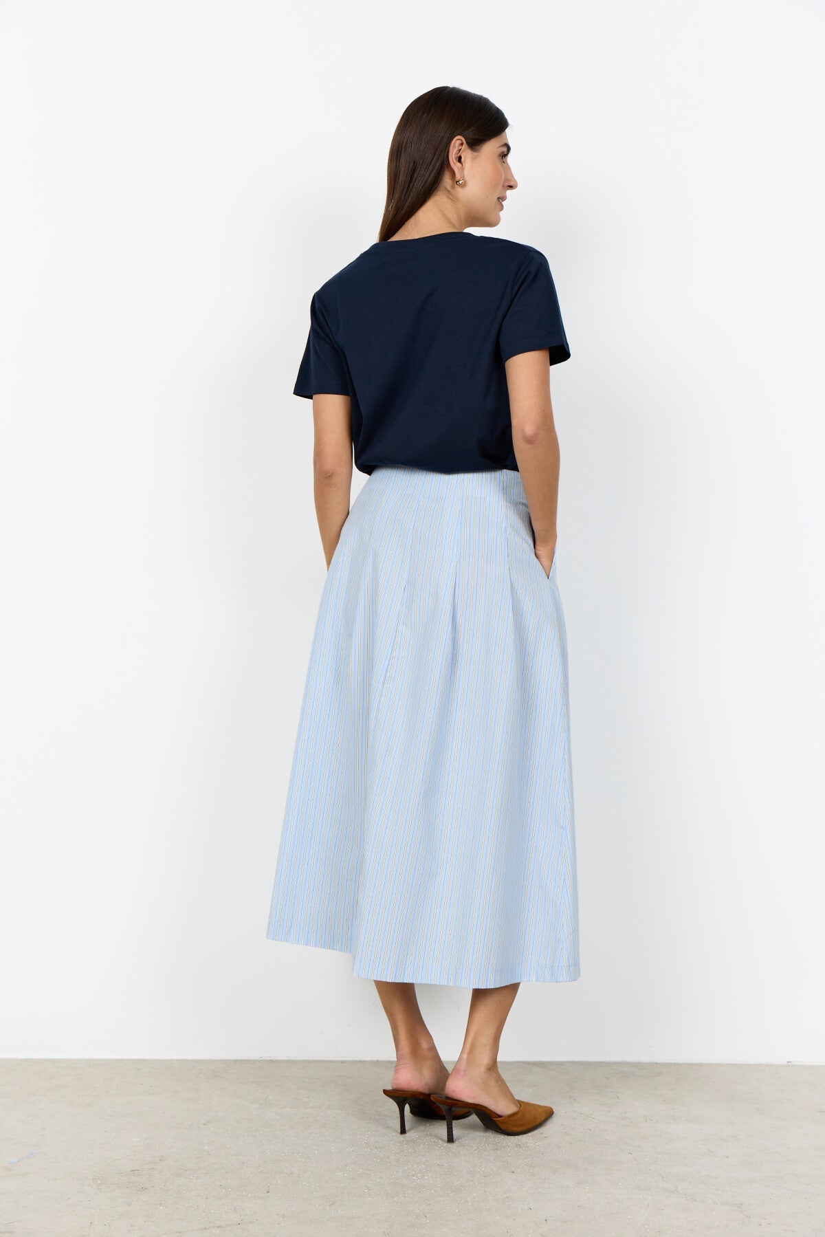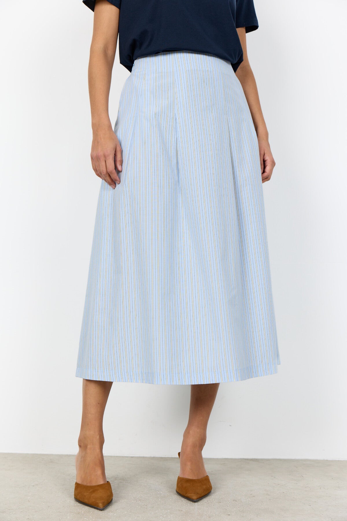 Der SC-CASSY 4 Rock ist aus 53% recyceltem Polyester und 47% Bio-Baumwolle gefertigt. Der Rock hat eine schmeichelhafte A-Linien-Silhouette mit dezenten Falten und einem klassischen Nadelstreifen-Print. Kombinieren Sie ihn mit einer einfachen Bluse und Sandalen für einen eleganten Look.