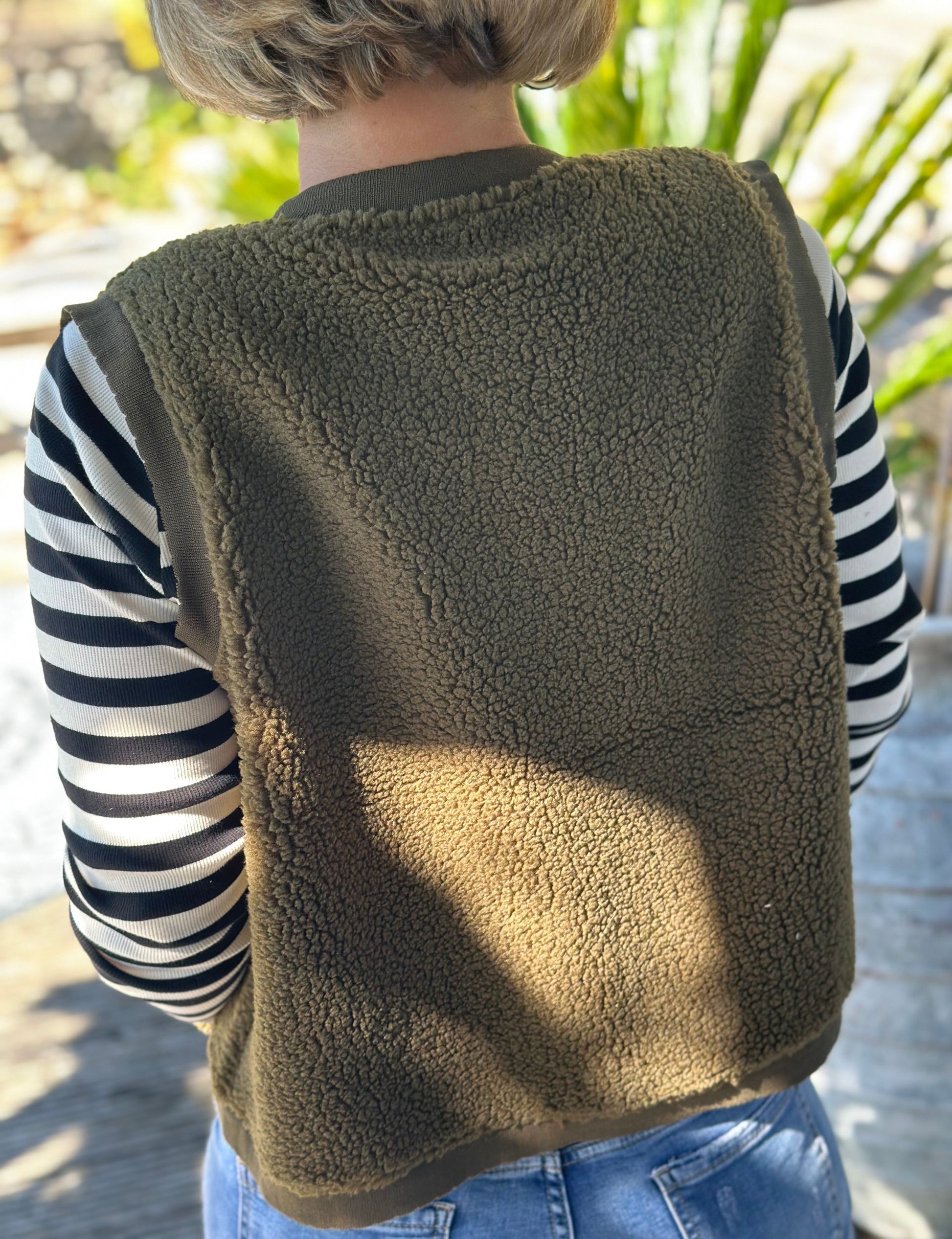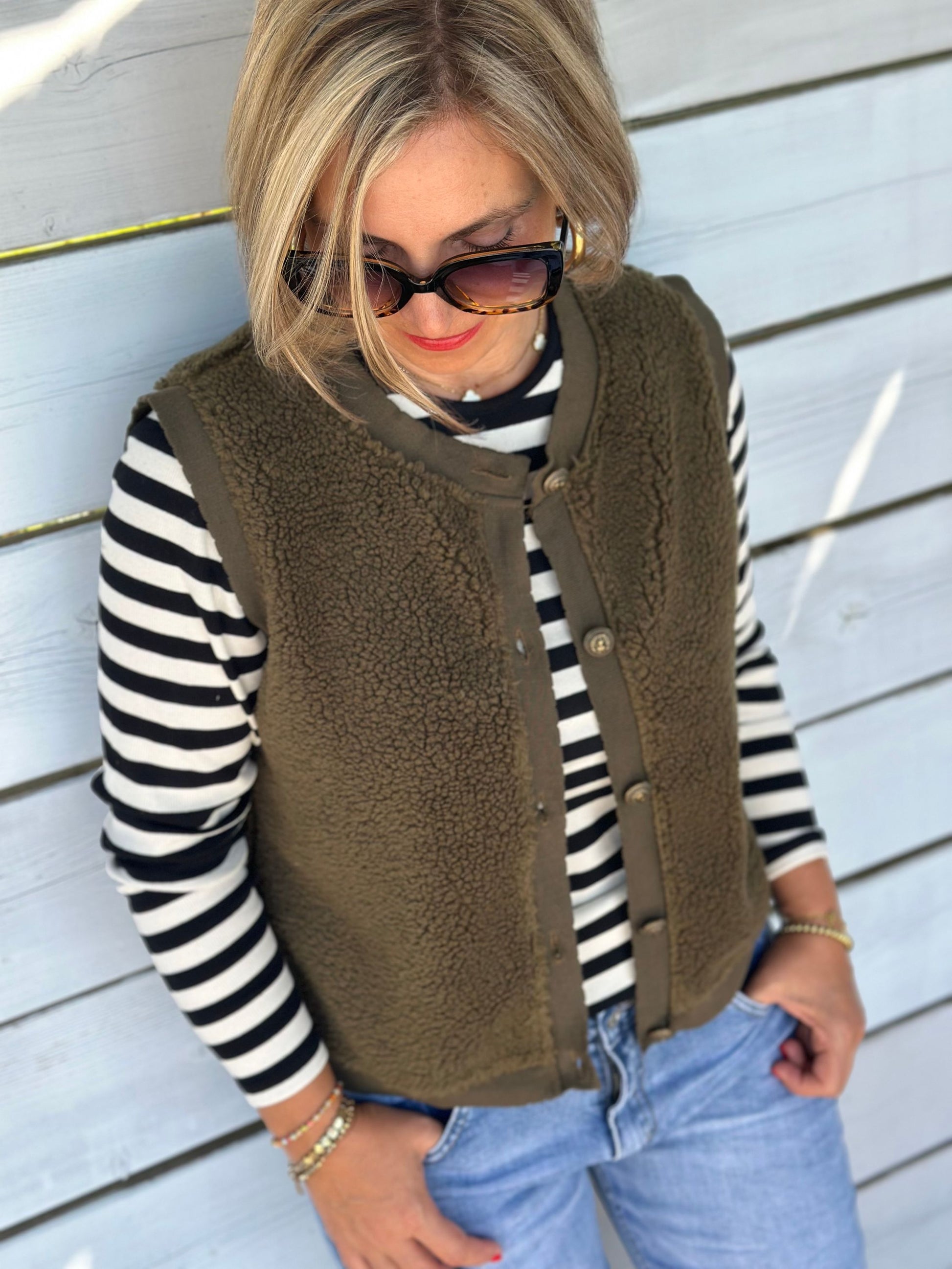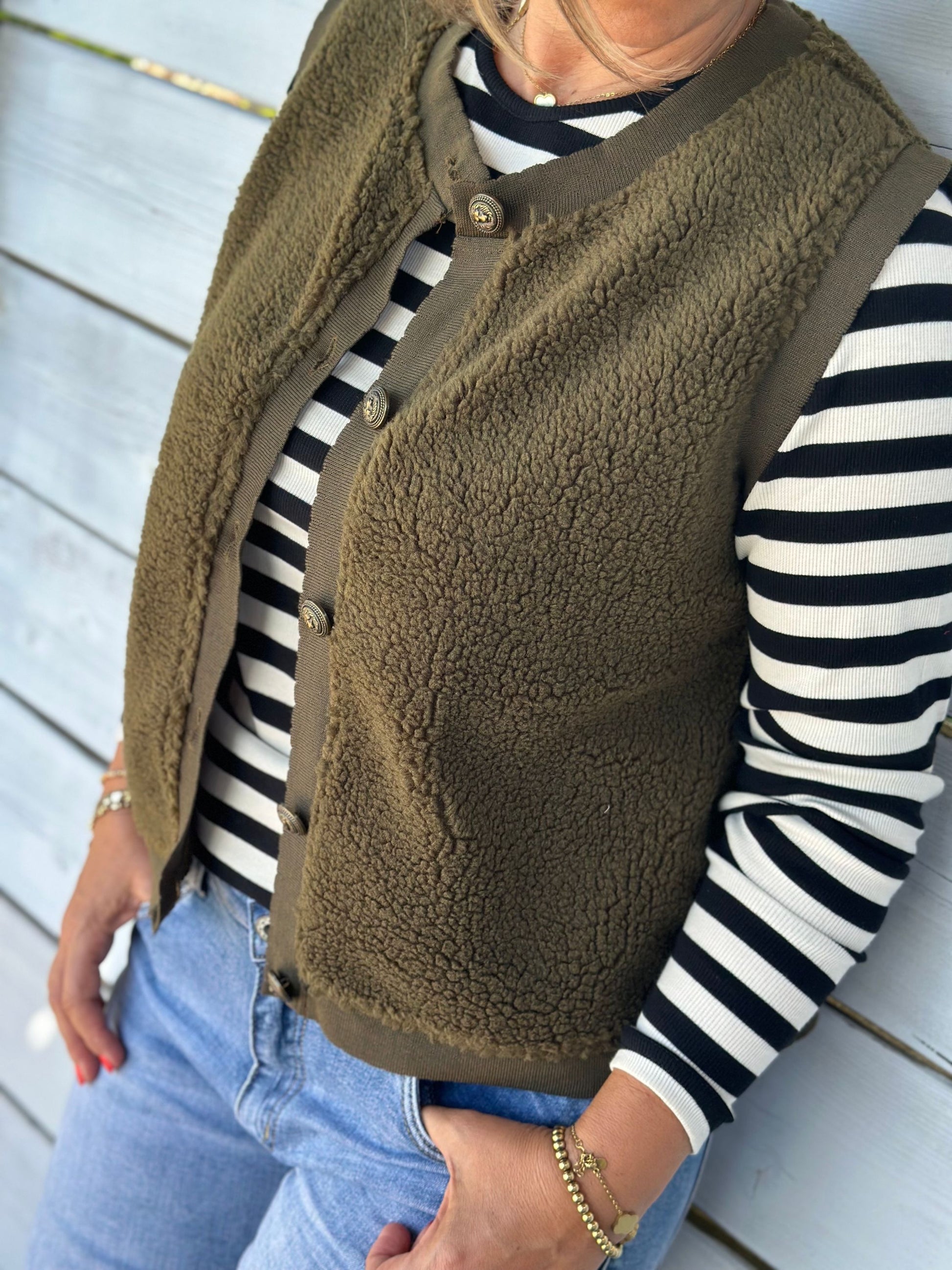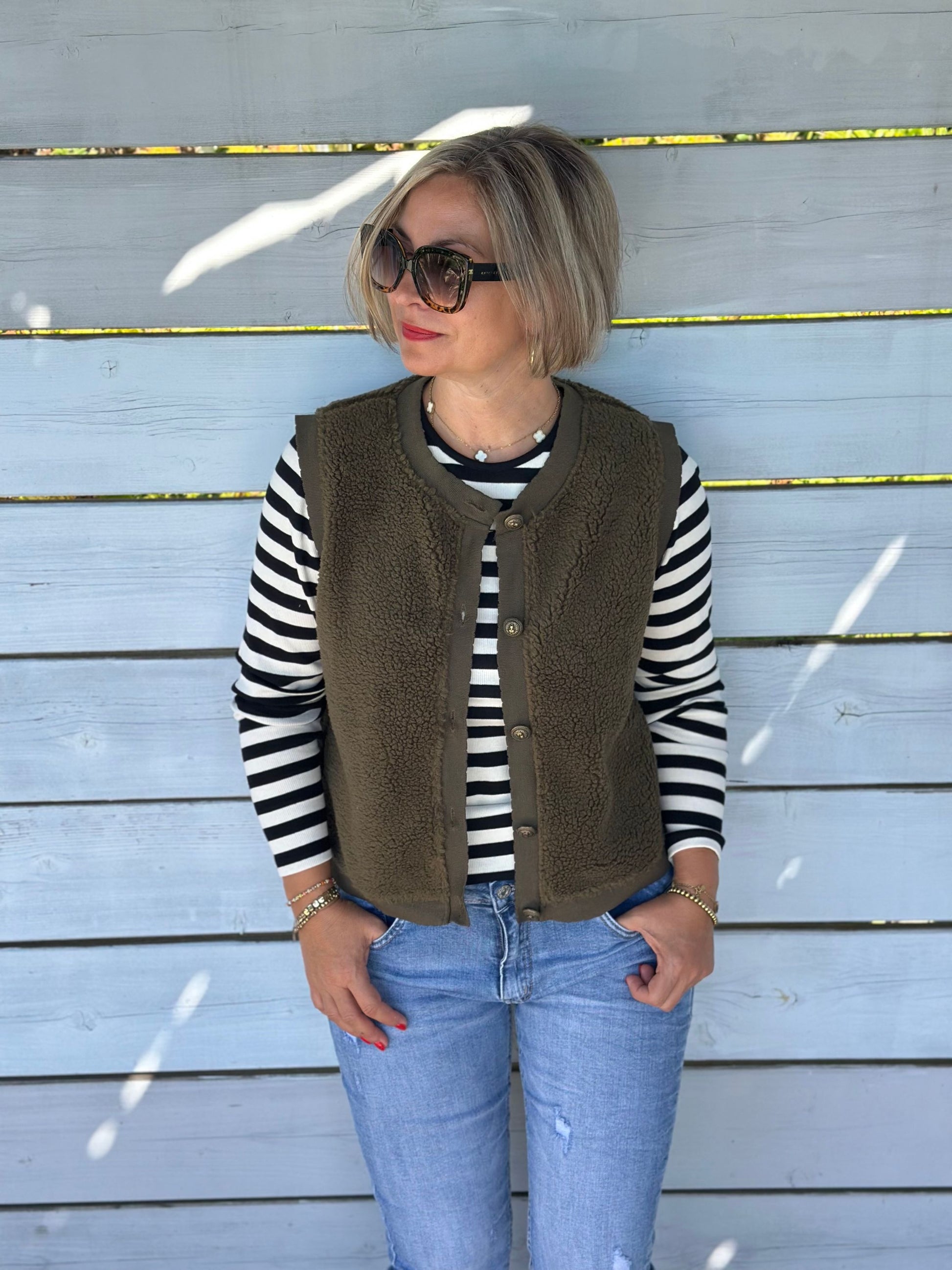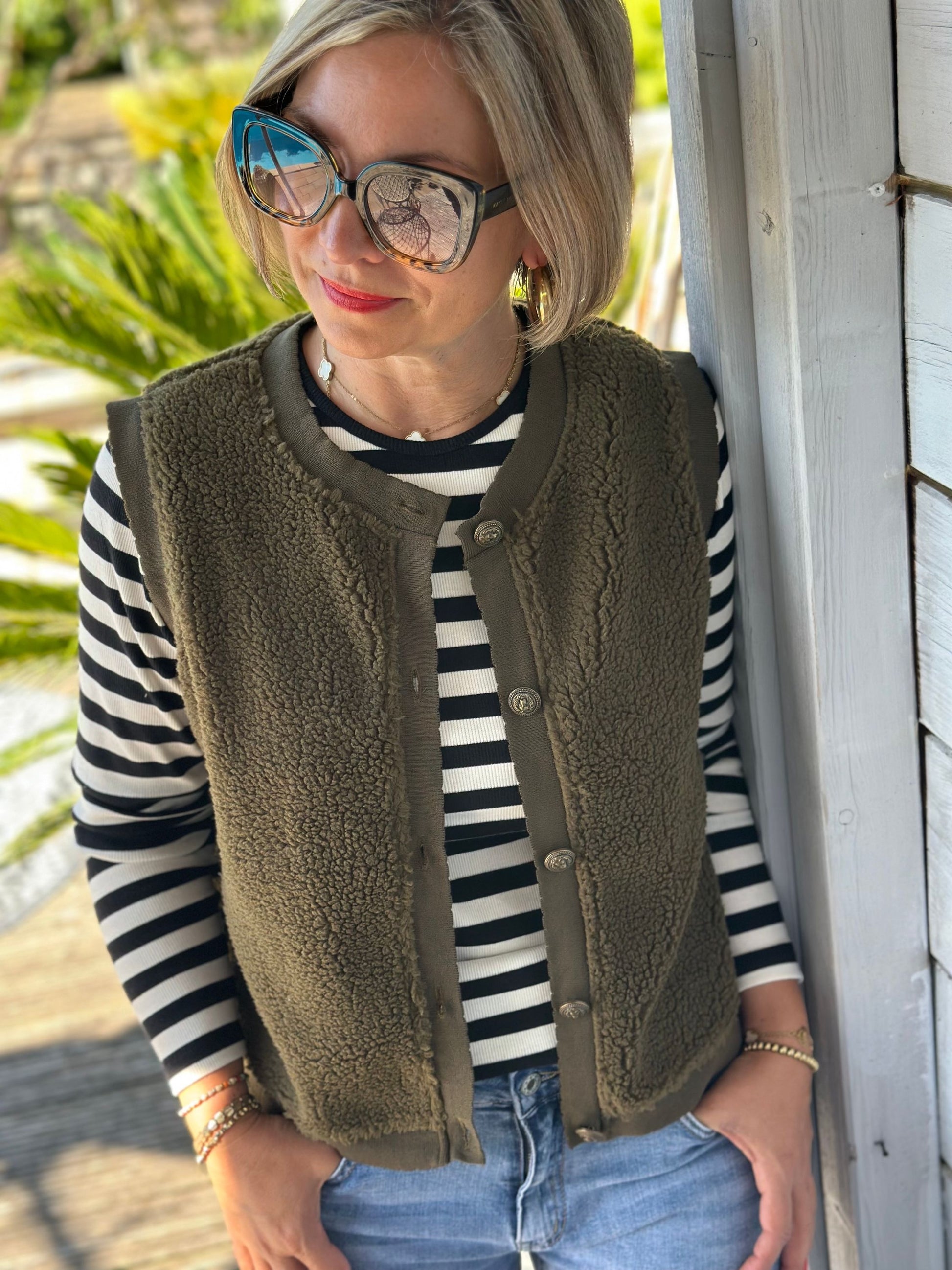 Die SC-ONYX 6 Weste ist aus 100 % recyceltem Polyester gefertigt. Sie hat einen Rundhalsausschnitt, einen Knopfverschluss vorne und eine strukturierte Oberfläche. Kombiniere sie mit Jeans und einem langärmeligen Oberteil für einen mehrschichtigen Look.