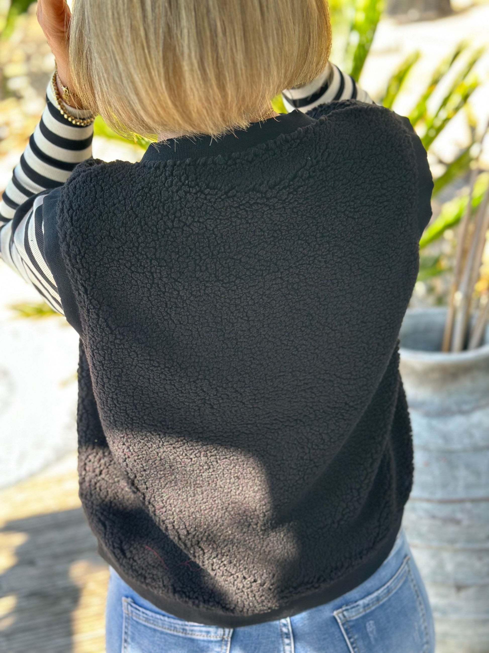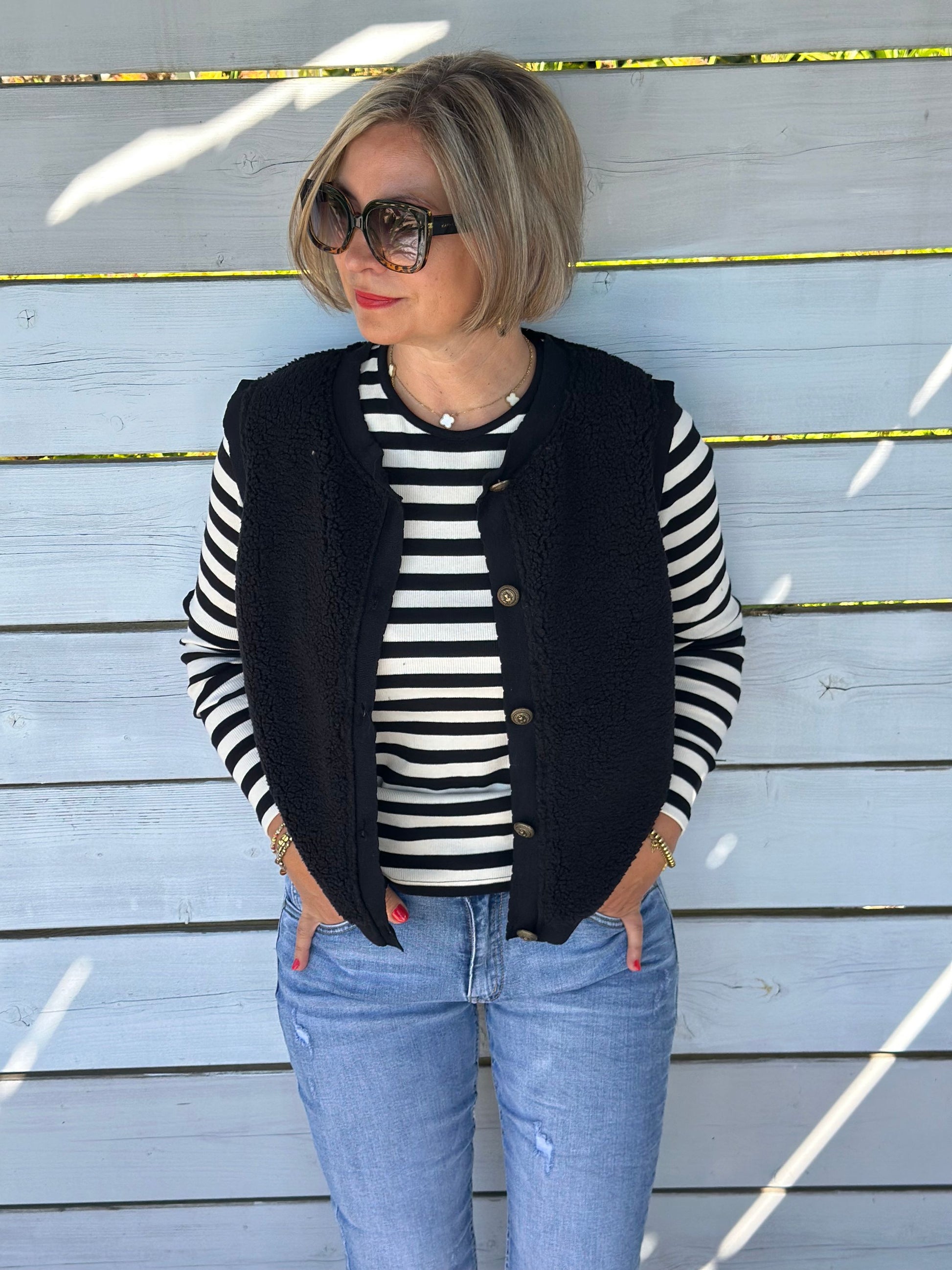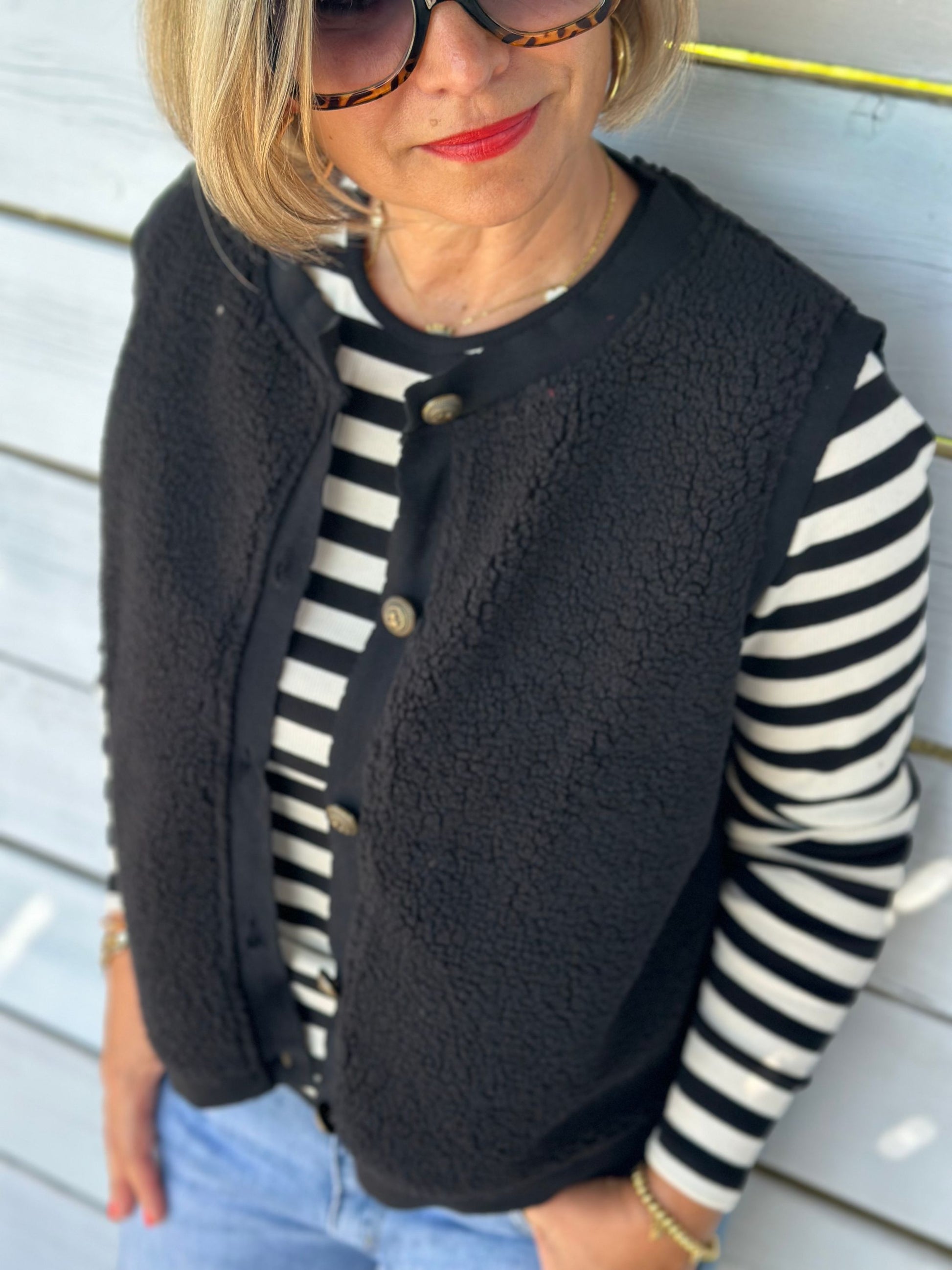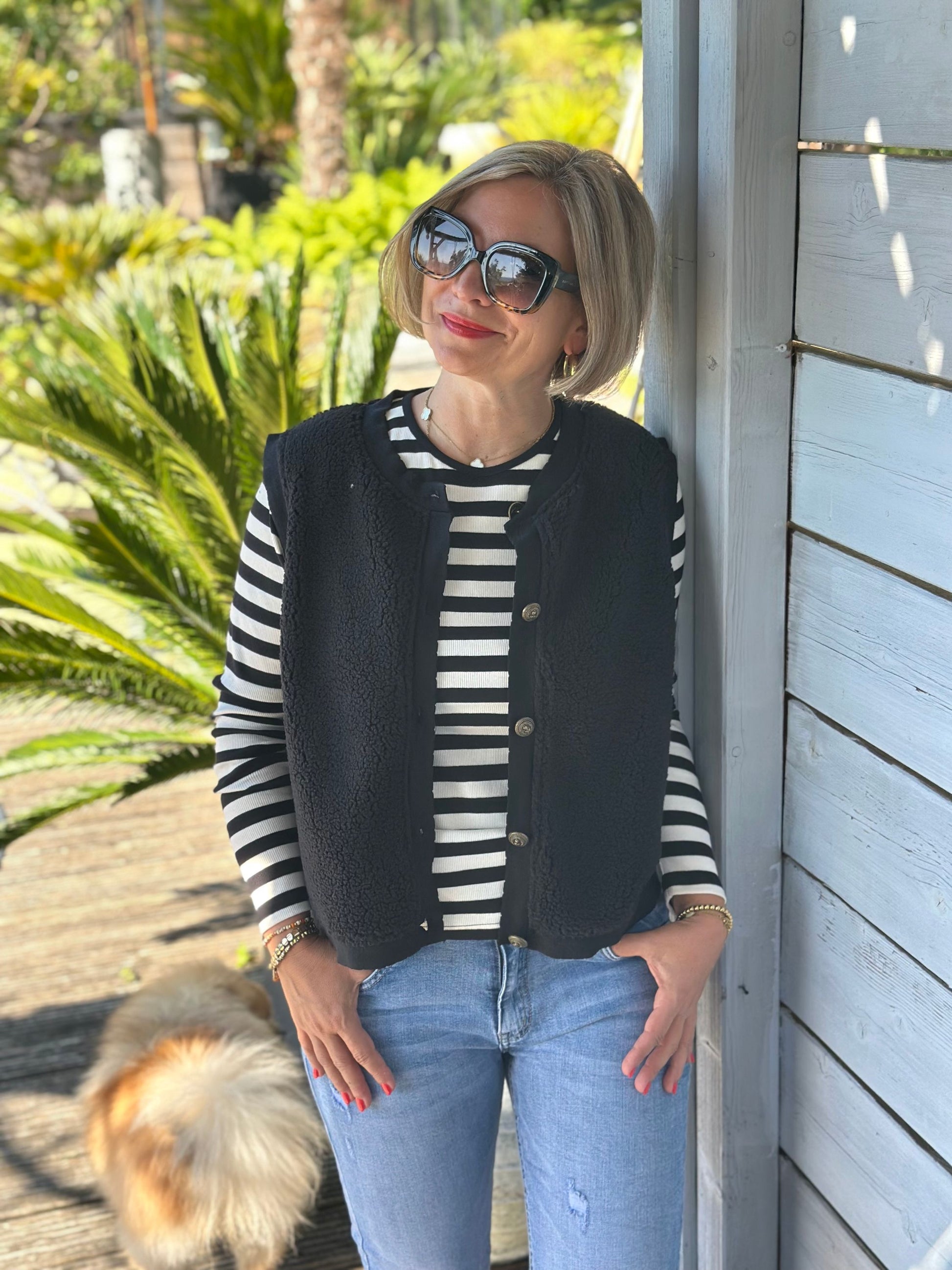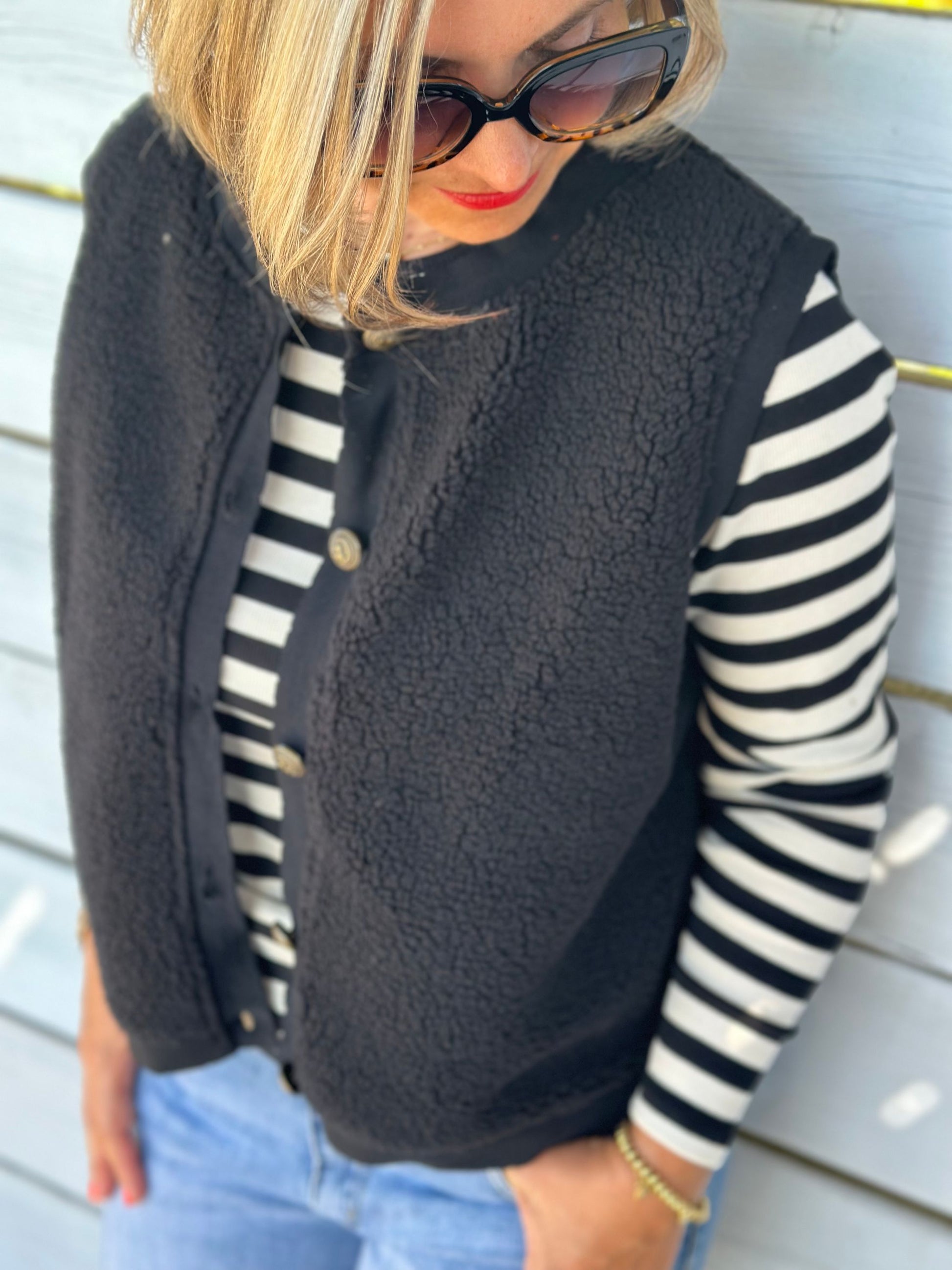 Die SC-ONYX 6 Weste ist aus 100 % recyceltem Polyester gefertigt. Sie hat einen Rundhalsausschnitt, einen Knopfverschluss vorne und eine strukturierte Oberfläche. Kombiniere sie mit Jeans und einem langärmeligen Oberteil für einen mehrschichtigen Look.