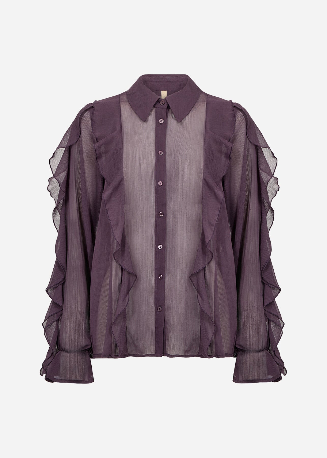 Das SC-NAIA 5 Hemd ist aus 100 % recyceltem Polyester hergestellt. Es hat einen klassischen Kragen, eine geknöpfte Vorderseite, gerüschte Details und einen transparenten, strukturierten Stoff. Kombiniere es mit einer maßgeschneiderten Hose oder einem eleganten Rock für einen eleganten Look.